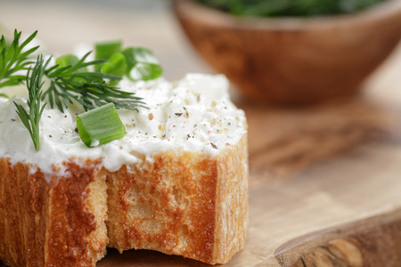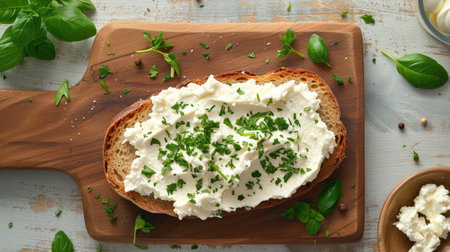 Home made bread on a wooden cutting board with curd cheese and ricotta and herbs. Decorated with green herbs