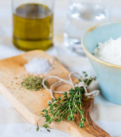 Cozy rustic home kitchen still life, dried herbs thyme, salt.