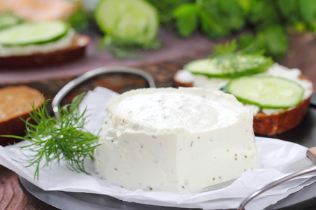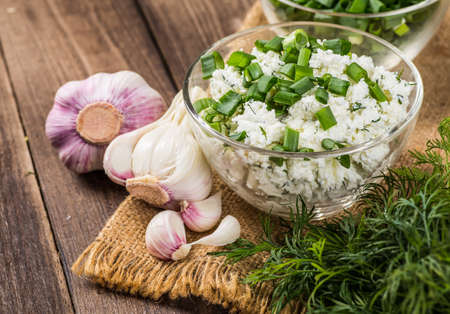 Fresh made Herb Curd (close-up shot) on vintage background