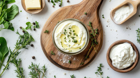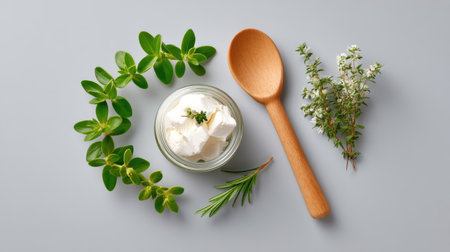 A visually appealing arrangement featuring fresh herbs alongside a creamy spread in a glass container and a wooden spoon, perfect for culinary art.
