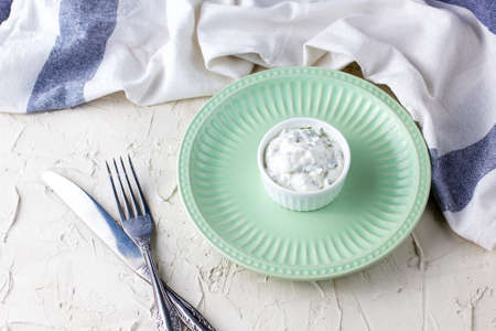 Homemade white sauce with herbs on an empty light green plate for your snacks. With a fork knife and napkin on the table