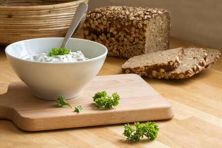 fresh curd cheese dip with herbs in a white bowl on a kitchen board, rustic multigrain bread in the background, healthy breakfast or dinner