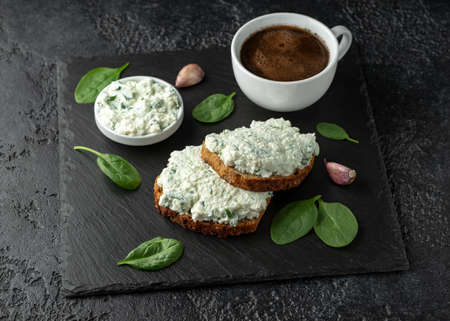 Ricotta cheese spinach sandwich with coffee. healthy breakfast