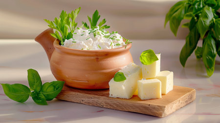Cottage cheese with basil and parmesan in a clay pot