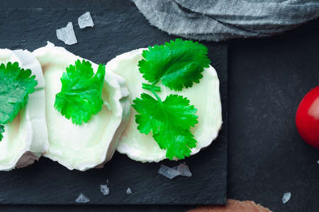 Cheese camambert from oregano herbs on slate board