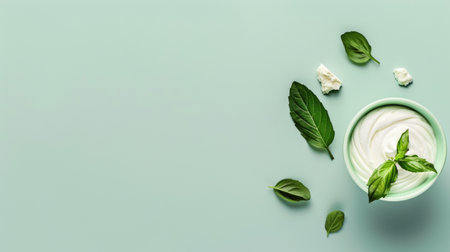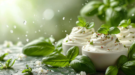 A vibrant arrangement featuring creamy cheese spread topped with fresh basil leaves in a wooden bowl. Perfect for culinary inspiration and healthy meals.