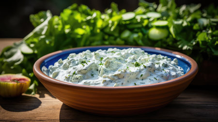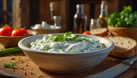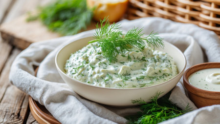 Creamy tzatziki is served in a rustic bowl, garnished with fresh dill and mint, creating a refreshing and flavorful appetizer or side dish, perfect for mediterranean cuisine