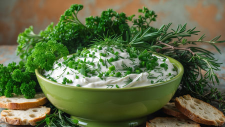 AI Generated. Sour Cream Dip with Fresh Herbs in Green Bowl
