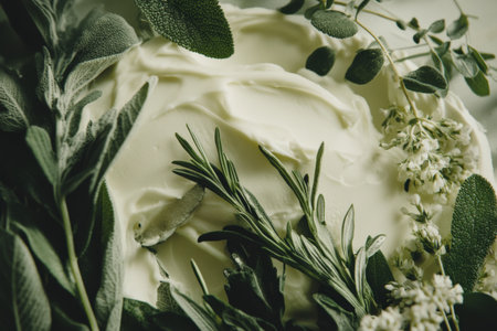 Cream cheese spread sits elegantly on a wooden plate, garnished with fresh basil and thyme. Ideal for culinary use in home cooking or food styling.