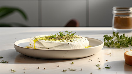 homemade yogurt cheese - labneh, topped with seeds and olive oil, showcased in a white plate in a modern kitchen, a minimalist and modern composition.