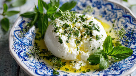A round piece of creamy burrata cheese is drizzled with olive oil and topped with fresh herbs like basil and parsley. This vibrant dish is beautifully arranged in a blue patterned bowl.