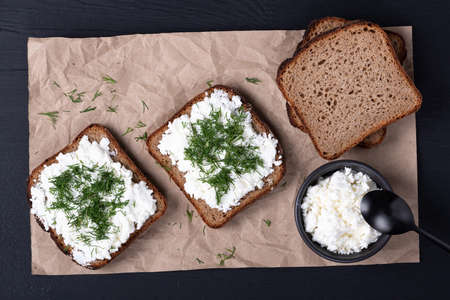 Curd sandwiches with fresh herbs. Fresh rye bread with cottage cheese and green herbs. Concept proper snack.