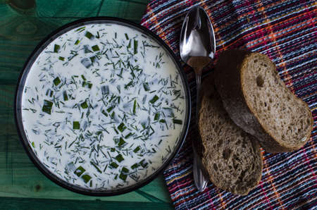 cold soup with vegetables and herbs based on milk and the products from which it is prepared top view