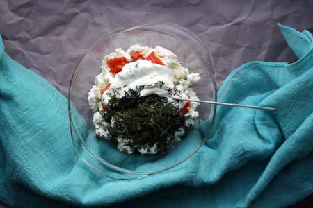 Cottage cheese, tomatoes, dill and sour cream in a bowl. Space for text.