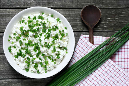 Cottage cheese with chives on wooden table