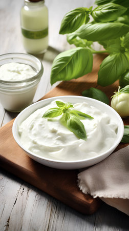 Sour cream with basil in a white bowl on a wooden background