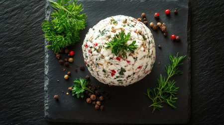 A beautifully arranged herb cheese ball on a slate board, showcasing vibrant colors and textures. Perfect for appetizers, parties, or gourmet meals.