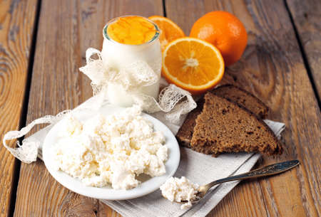 Assortment of breakfast products (homemade yogurt, cottage cheese, orange jam, rye bread) on a wooden table. Selective focus