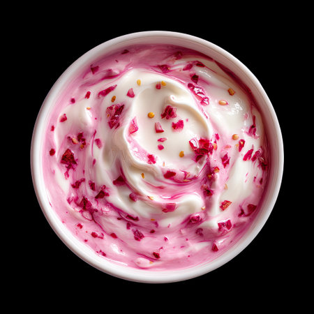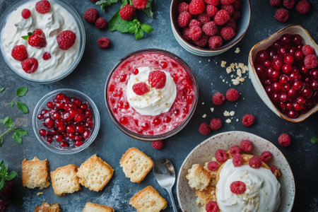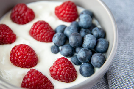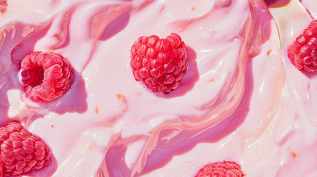 Fresh raspberries on creamy yogurt texture - perfect for culinary and food design