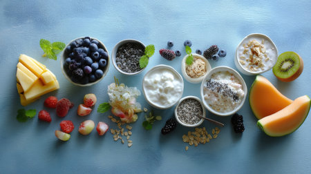 A vibrant display of fresh and healthy breakfast ingredients arranged on a light blue surface. Bowls contain yogurt, berries, nuts, and oats.
