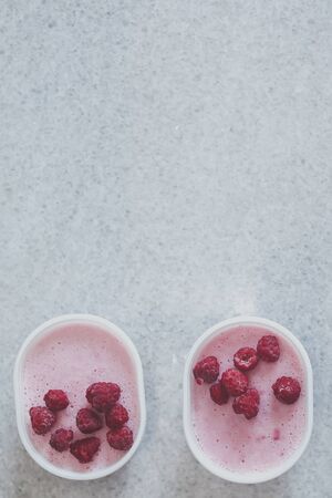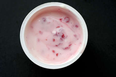 cream yogurt in a plastic cup on a black background. curds' products with raspberries top view. Yogurt in a glass, delicious breakfast.