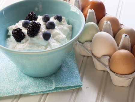 Greek yogurt with fresh berries and eggs on white background, top view