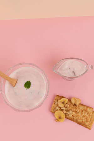 strawberry yogurt and biscuits, ivory pink background