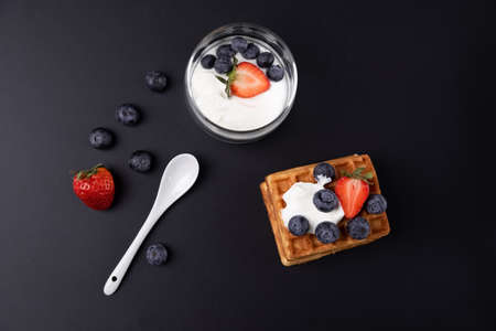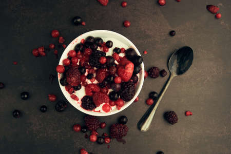 Natural fresh Greek yogurt with raspberry, blueberry berries in dark plate and napkin for healthy breakfast.