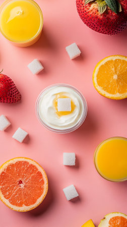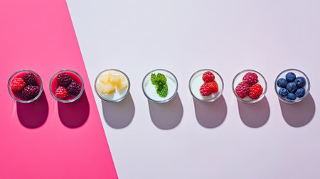 This vibrant composition features an assortment of fresh fruits and yogurt in small bowls, highlighting healthy ingredients with colorful presentation.
