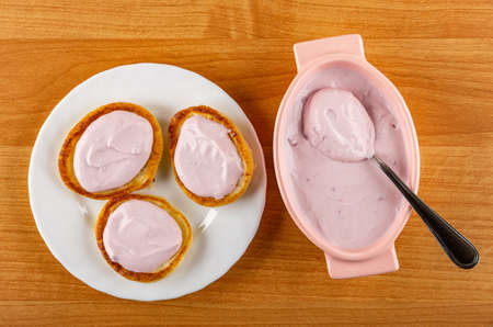 Sandwiches from small pancakes with soft cottage cheese in white plate, teaspoon in pink bowl with soft cottage cheese on wooden table. Top view