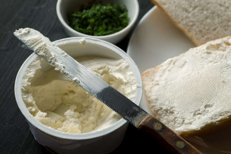 Fresh greenery, white bread and curd cheese on a black wooden table.