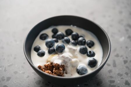 chocolate granola with fresh blueberries ang greek yogurt in black bowl on concrete background, shallow focus