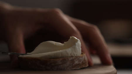 man hand spreading cream cheese on slice of dark ciabatta