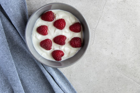 Natural fresh Greek yogurt with red raspberry berries in the gray plate and napkin for healthy breakfast. Stone background.