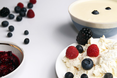 Cottage cheese in white souser, berry, jam and sour cream in white bowl on white background..