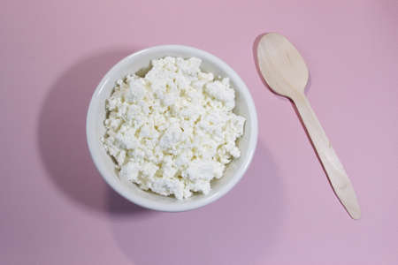 Cottage cheese in white bowl on pink table with spoon. Top view. Horizontal orientation.