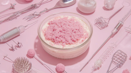 This eye-catching flat lay features a pink dessert in a transparent bowl, complemented by various kitchen tools on a soft pastel background, evoking a delightful culinary experience.
