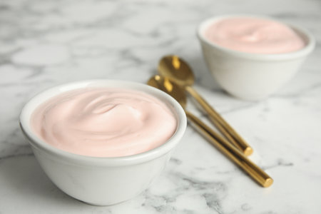 Tasty organic yogurt on white marble table. Space for text