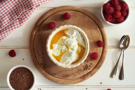 Cottage cheese and flax seed oil with fresh raspberries and linseeds, top view. Budwig diet.