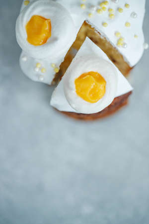 On a gray wooden table and Easter cake, sweet table for the holiday, Easter holiday, Easter decor. High quality photo.