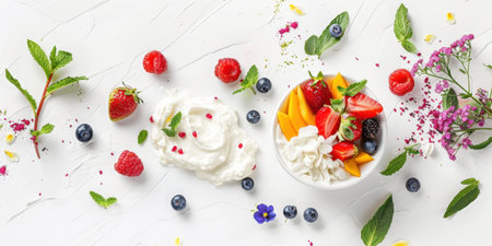 Greek yogurt with fresh berries in bowl on white background, top view
