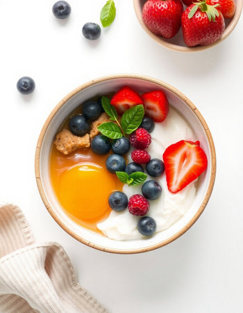 Enjoying a healthy breakfast bowl with mixed berries, Greek yogurt, and honey for energy