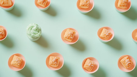 A visually appealing layout featuring an array of delicate desserts and creamy ice cream scoops in colorful pastel bowls, set against a soothing mint background, perfect for food lovers.