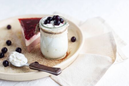 Diet layered dessert blancmange made from soy milk, carob and fruit jelly with cherry and black currant. White yogurt in glass jar on white background. Cool healthy dessert. Copy space