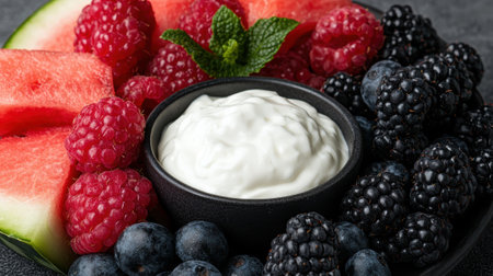 Fresh fruit platter with berries, watermelon, and yogurt.
