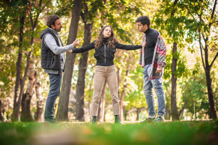 The woman tries to separate the two aggressive, angry, nervous and upset men in quarrel and stands between them with her arms outstretched. Group quarrel concept