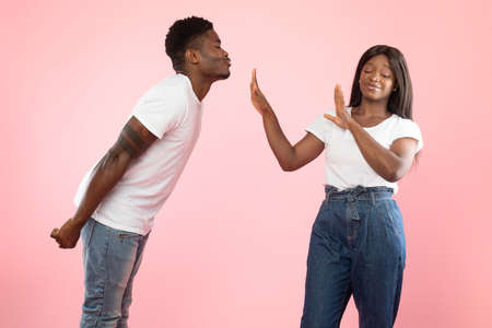 Man trying to kiss disgusted woman rejecting him