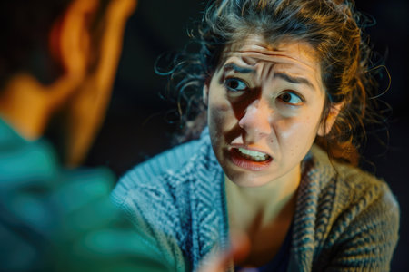 A woman stars intensely at a person off-camera, her face expressing fear and concern. The lighting creates a dramatic and shadowy atmosphere.