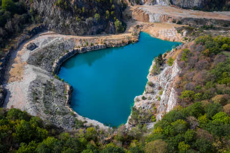 Lake formation in an old abandoned quarry. Quarry lake. Crushed stone dumps in a closed area for stone extraction. Termination of mining operations.