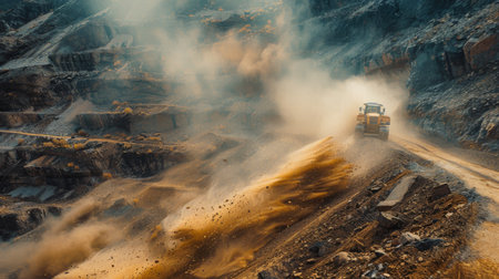 Heavy Machinery Drives Through Dusty Quarry at Sunset Creating a Dramatic Landscape of Earth and Shadows. Generative AI